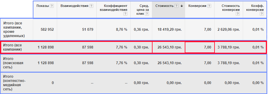 Рекламная кампания клиента в Гугл Адвордсе велась с сентября 2015 года. В аккаунте были настроены 15 рекламных кампаний в поисковой сети. Эффективность рекламных кампаний была просто ужасающей: за 26 тысяч гривен клиент получил всего 7 конверсий (с отслеживанием конверсий все в порядке)