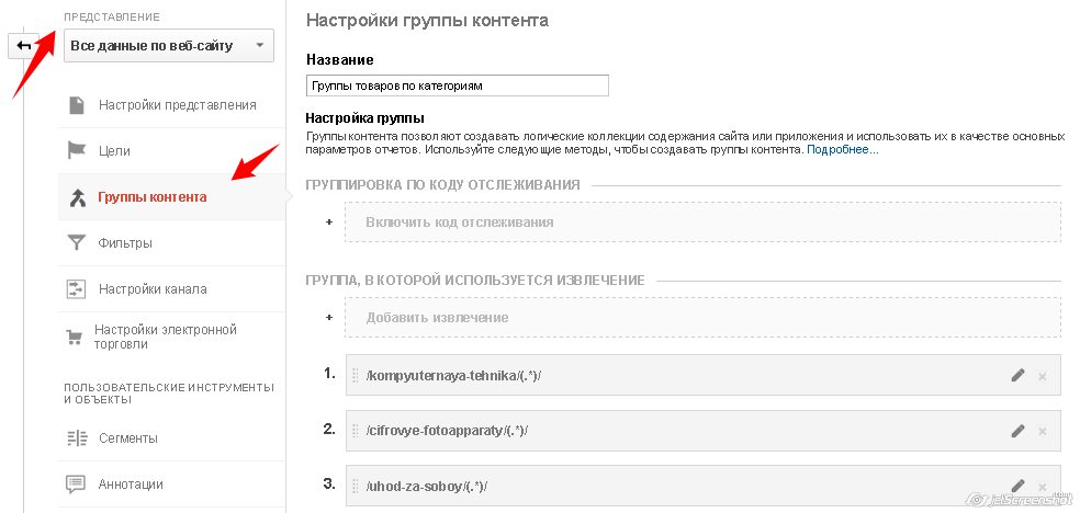 Для того, чтобы увидеть какие группы товаров получают больше всего переходов, просмотров страниц и т.д., необходимо настроить «Группы Контента» на вкладке «Администратор – Представление – Группы Контента». Это особенно актуально для крупных магазинов, так как позволяет лучше анализировать как динамику спроса у покупателей, так и качество и полноту предлагаемого ассортимента.