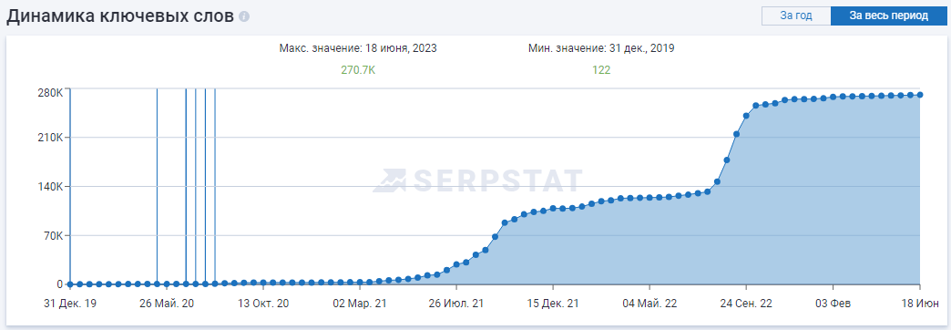 Такие показатели видимости и прироста органического трафика обусловлены высокими позициями сайта по высокочастотным запросам и достигнуты благодаря постоянному увеличению точек входа на сайт: