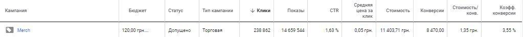 Еще один шаг к лучшим результатам — настройка торговой рекламы. Товарная реклама помогла значительно увеличить коэффициент конверсии и при этом мы снизили цену за клик — средняя цена за клик 0,05 грн, а стоимость конверсии 1,35 грн: