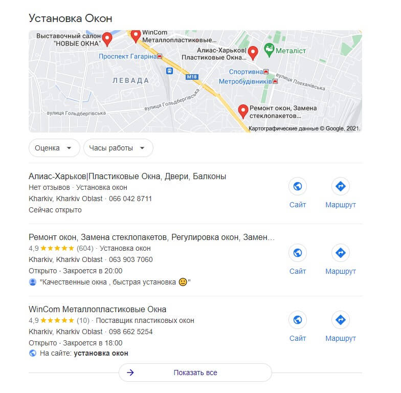 Как показывает практика, занять высокие позиции в локальной выдаче легче, чем по общим запросам. Поэтому мы рекомендуем всем молодым компаниям в первую очередь направлять усилия на ранжирование именно в регионе обслуживания клиентов.