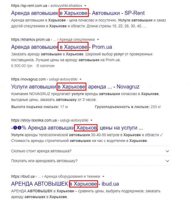 Что касается контента, в нем также должны присутствовать вхождения региона в котором оказывает услуги продвигаемая компания. Это также является одним из способов показать поисковой системе релевантность страницы локальным запросам.