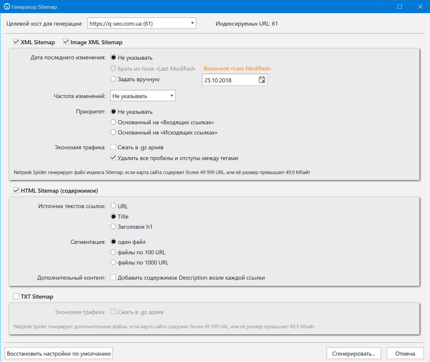 Позволяет в несколько кликов создать кастомную XML карту сайта, учитывая именно те параметры, которые Вы считаете необходимыми.