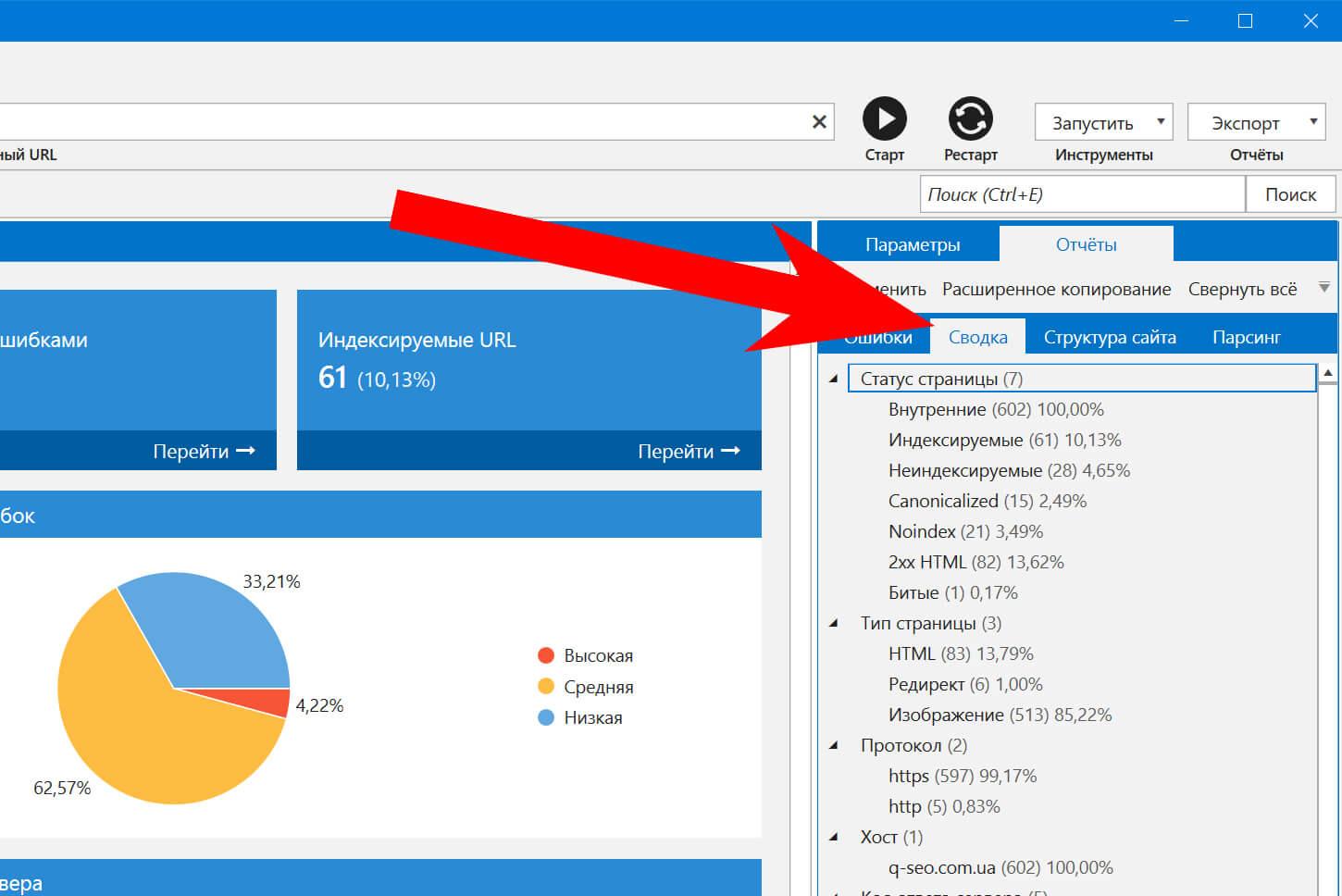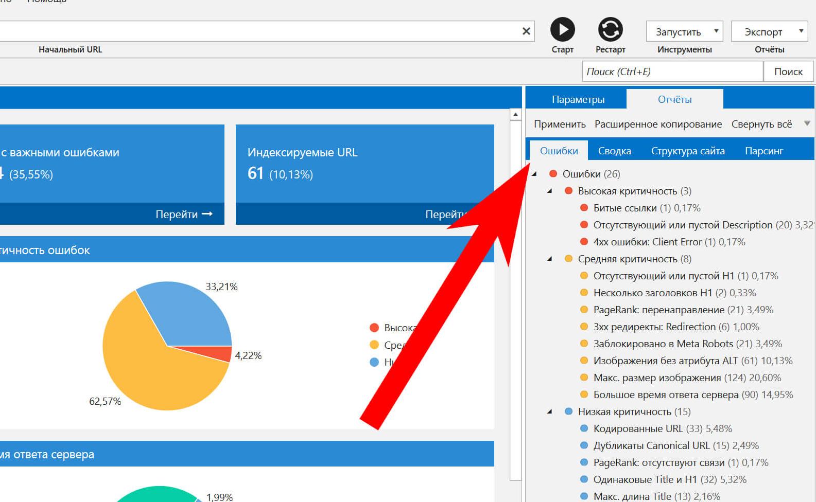 - URL с важными ошибками: отфильтрованные результаты сканирования с теми адресами страниц, где краулер обнаружил ошибки.