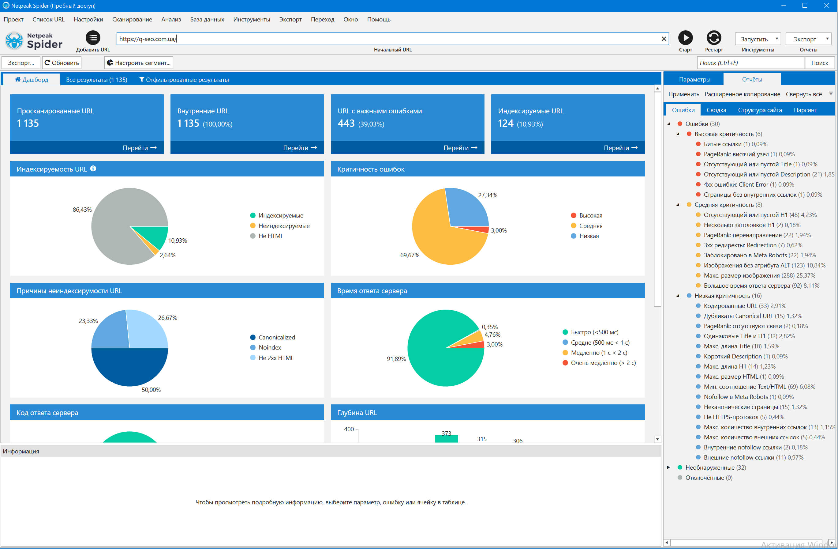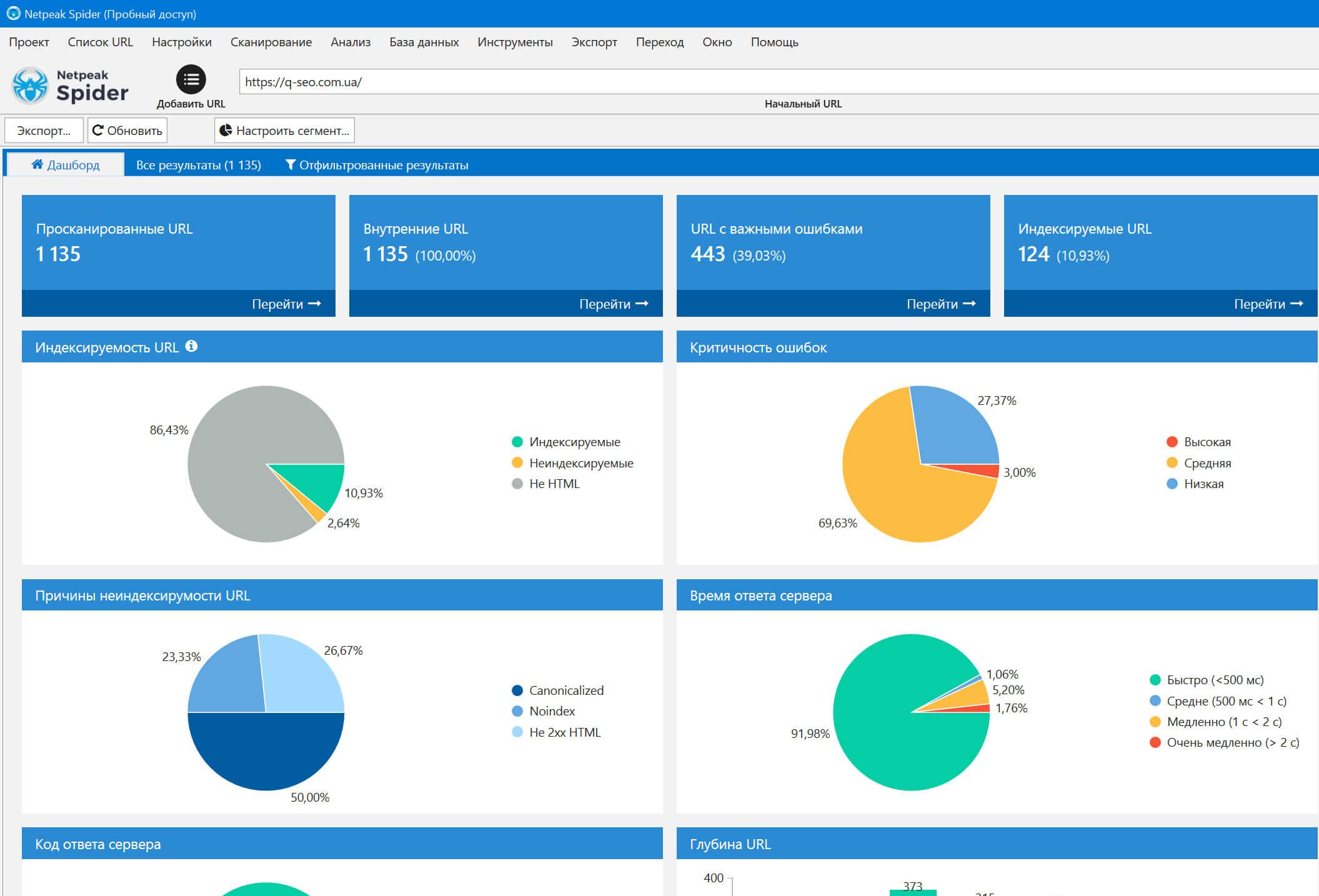 По окончанию сканирования с помощью диаграмм будут визуализированы данные по соотношению индексируемых и неиндексируемых URL, по полученным кодам ответа сервера, по времени ответа сервера, типу контента и т. д. Все элементы диаграмм кликабельны и позволят Вам быстро перейти к необходимым данным.