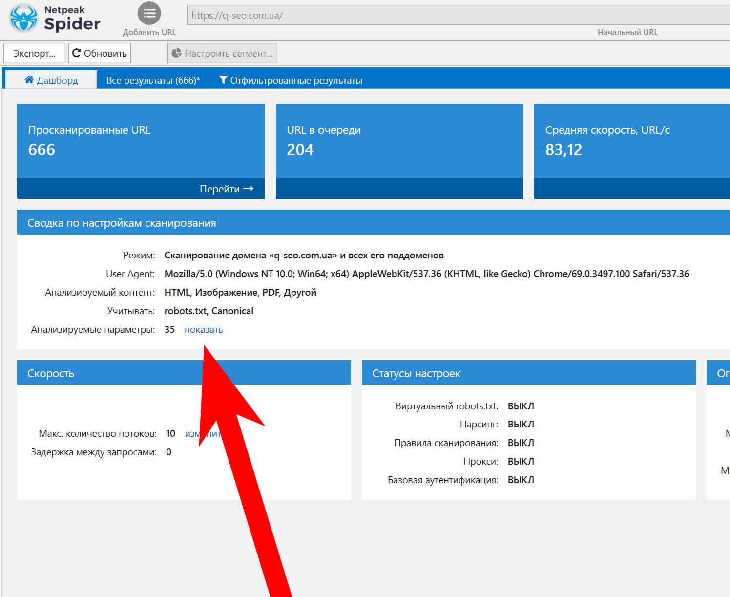 Непосредственно во время сканирования сайта Вы можете отобразить анализируемые параметры, нажав на соответствующую ссылку:
