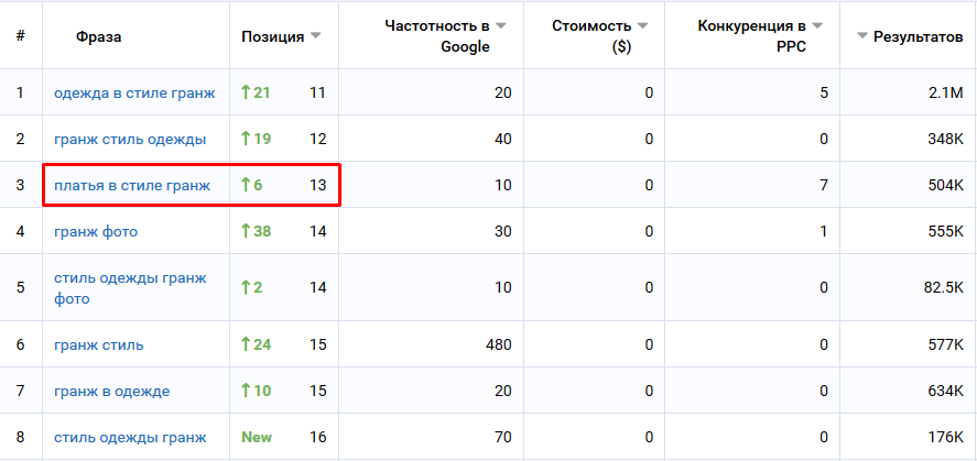 Тепер можна очікувати найближчим часом на вихід сайту в топ-10 на запит «сукні в стилі гранж».