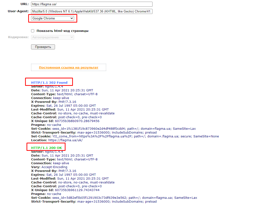 Тогда напрашивается очевидный выход из ситуации. Для поискового бота мы отдаем тот URL-адрес, который он и запрашивает. Таким образом поисковый бот попадает на нужную ему страницу, а пользователь в соответствии с законом - на украиноязычную версию сайта.