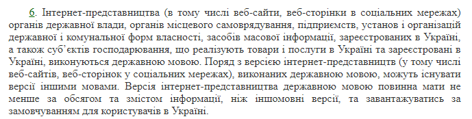 Выше представлена часть законопроекта, касающаяся сайтов. Что в ней сказано? Сайты, которые зарегистрированы, реализуют товары и услуги в Украине должны быть сделаны на украинском языке. Одновременно с этим сайт может содержать другие языковые версии. Но, украинская версия по объему не должна уступать другим языковым версиям сайта, а также загружаться по умолчанию для пользователей из Украины. Это касается также и страниц компаний в социальных сетях.
